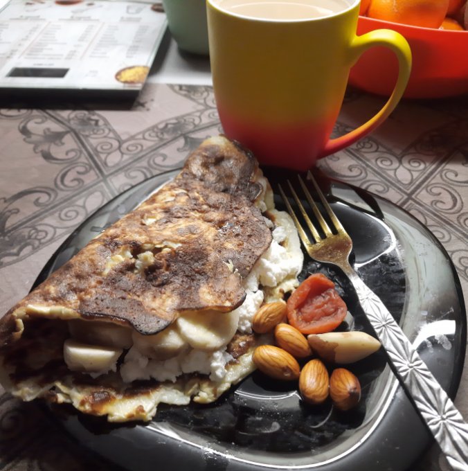 Доброе утро всем! Бодрого дня и хорошего настроения! На завтрак овсяноблин с рикоттой и бананом ☺️
