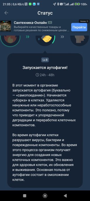 Сейчас, получается, уже голодаю 20 часов 45 минут. Организм переходит на питание кетонами из своего жира. Т.е. то же самое кето но без введения жиров в организм извне.