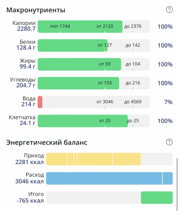 А чего не опубликовали дневник? Мне вот тоже прям интересно, как можно набрать такую калорийность с 200г воды всего лишь...