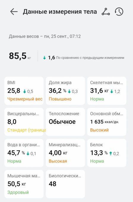 За неделю -1,6 кг веса, -1см в талии, -0.5см в бёдрах, за счёт