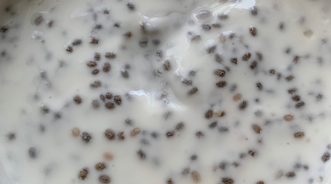 Добавить к кефиру пару чайных ложек семян чиа, перемешать