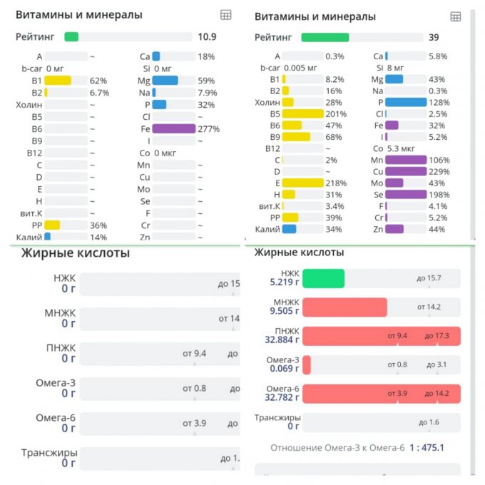 В первом столбике показаны нутриенты и жирные кислоты халвы, а во втором столбике - подсолнечные семечки (сухая жарка). Просто я не нашёл козинаков на просторах МЗР и вписываю себе в рацион их, но я помню при этом, что в них ещё есть патока, а это (я знаю) углеводы (сахар овощной)))