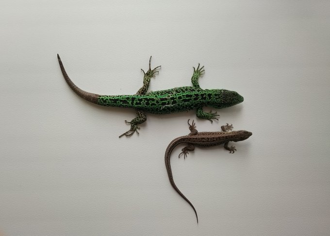 Как и обещал, выставляю фото главы нашего ящеричного семейства с малышом для сравнения. Папу зовут Крокодил, а самого маленького на данный момент из семейства - Шта.