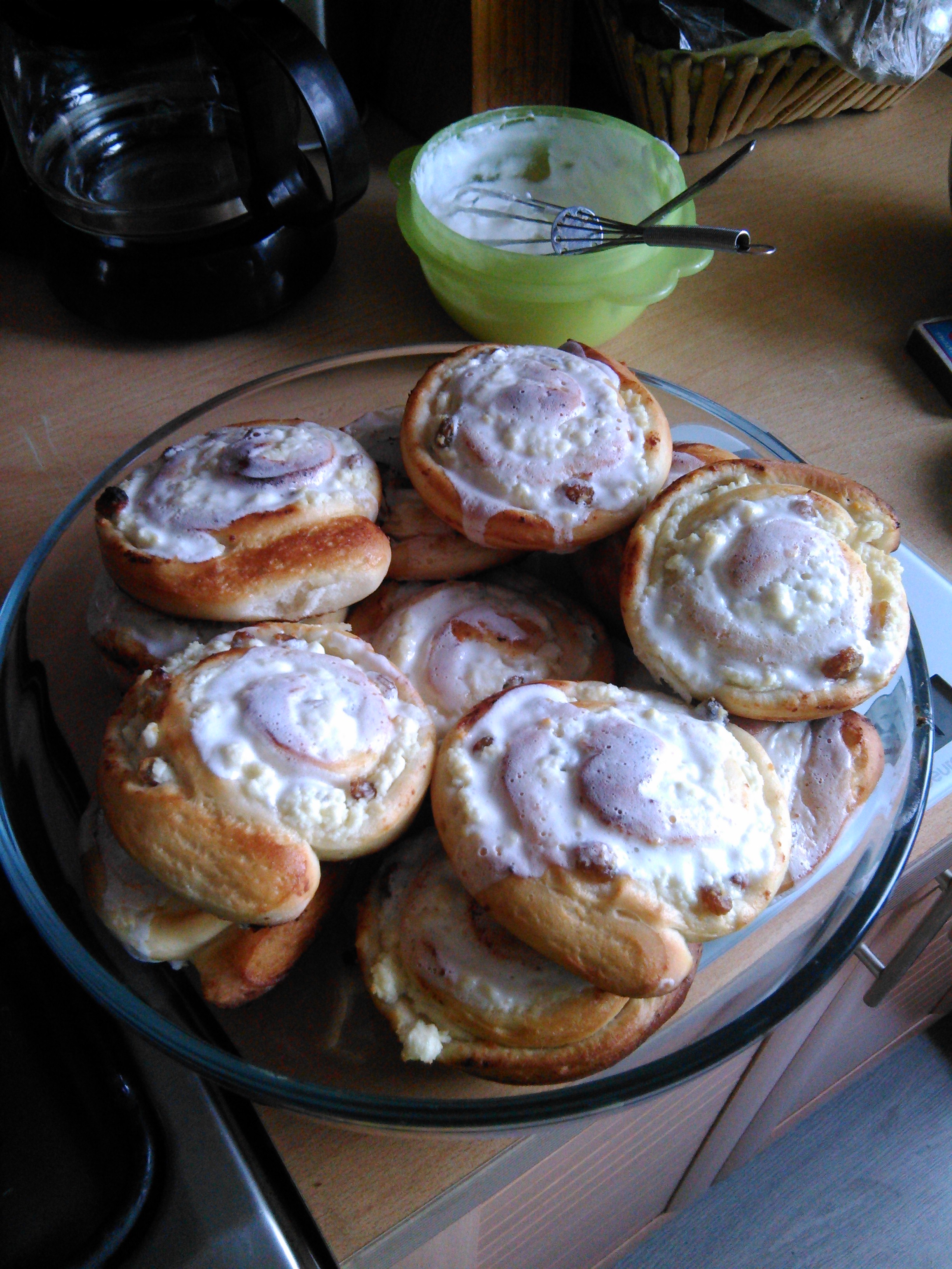 Сразу же после выпечки обильно смажьте завитушки сметанной заливкой,