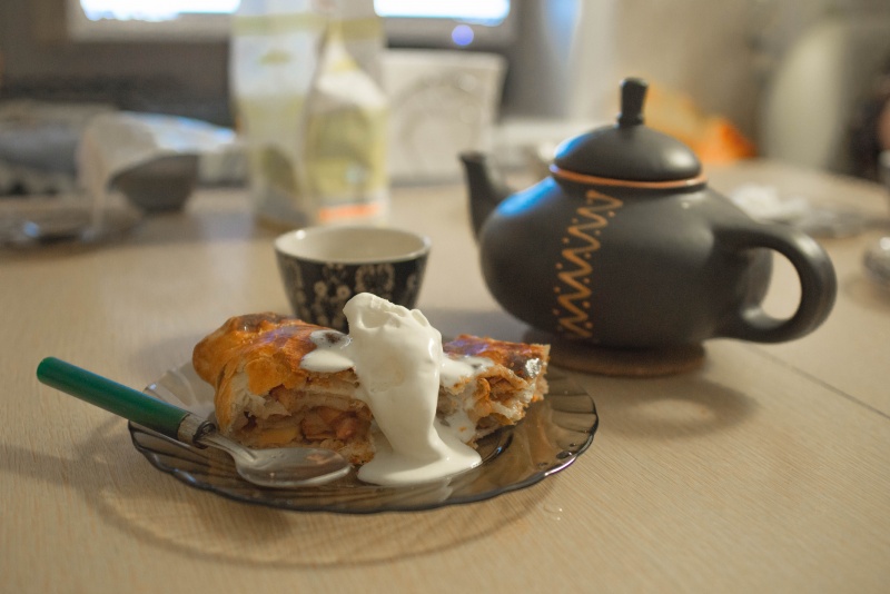 Накрываем все это другим слоем теста. На мои яблочки тесто не