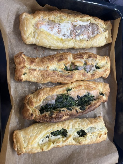 Сегодня мч приготовил вот такие пирожки с семгой и сыром (со шпинатом для него и без - для меня). Но немного шпината я все равно попробовала. Убедилась, что не мой продукт вообще :)