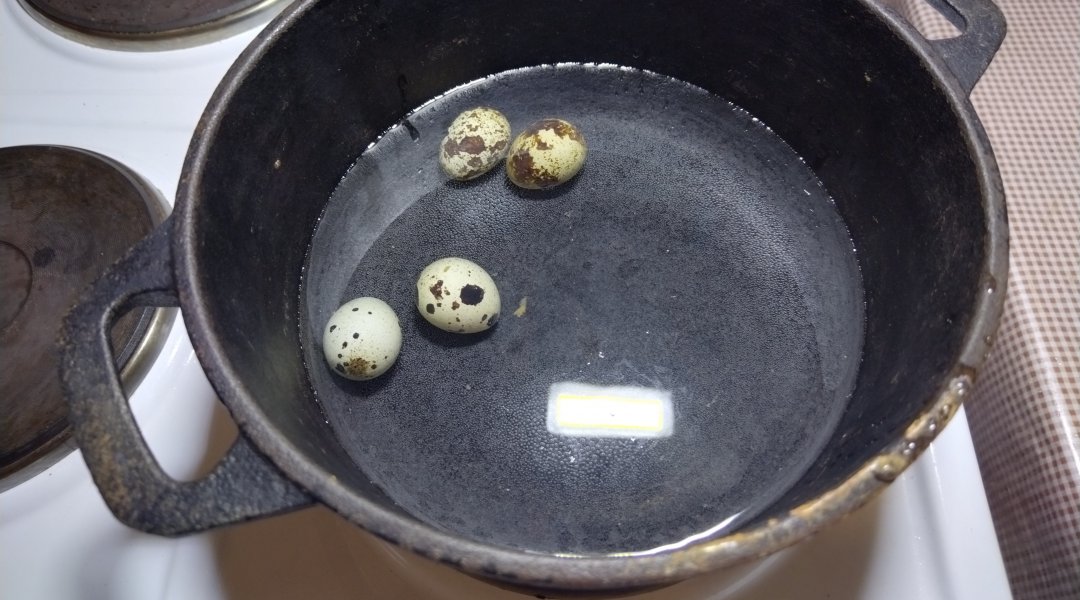 Отварить перепелиные яйца. Заложить яйца в холодную воду. После
