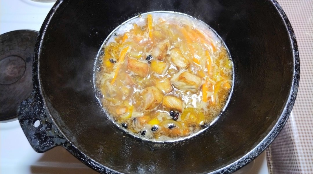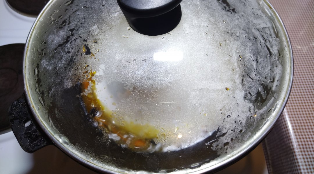 Убавить температуру, закрыть крышкой и тушить. Через 15 минут