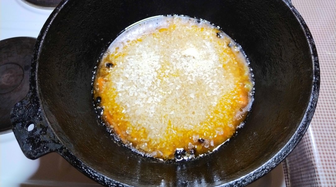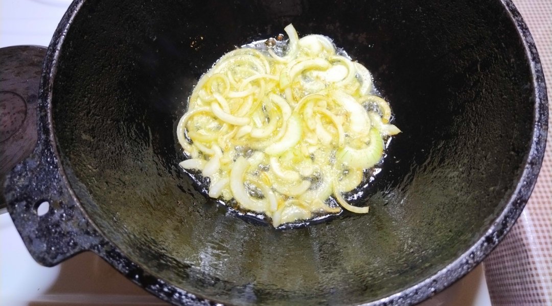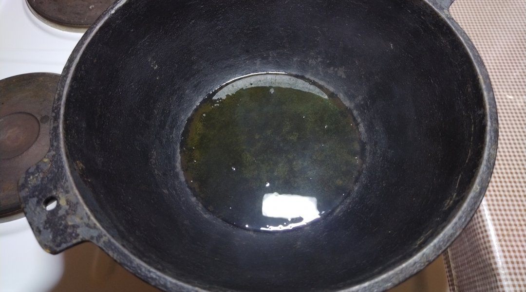 В раскалённый казан влить нерафинированное оливковое масло.