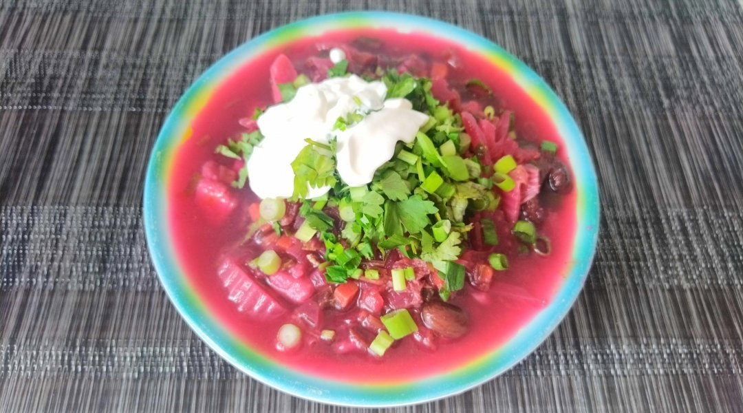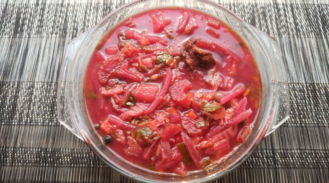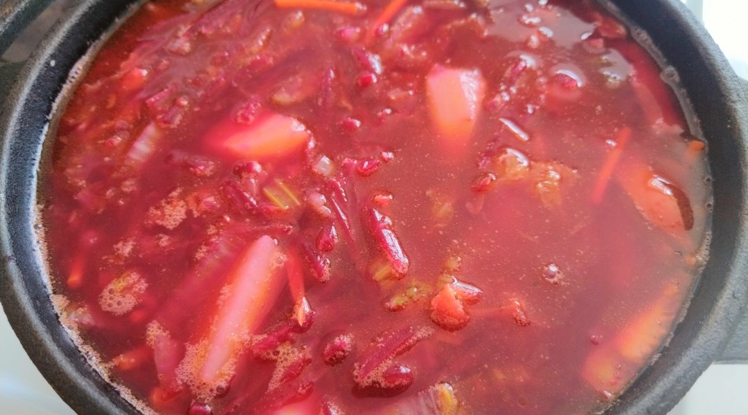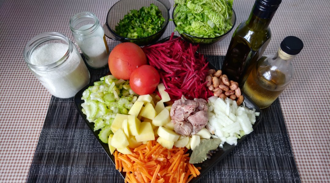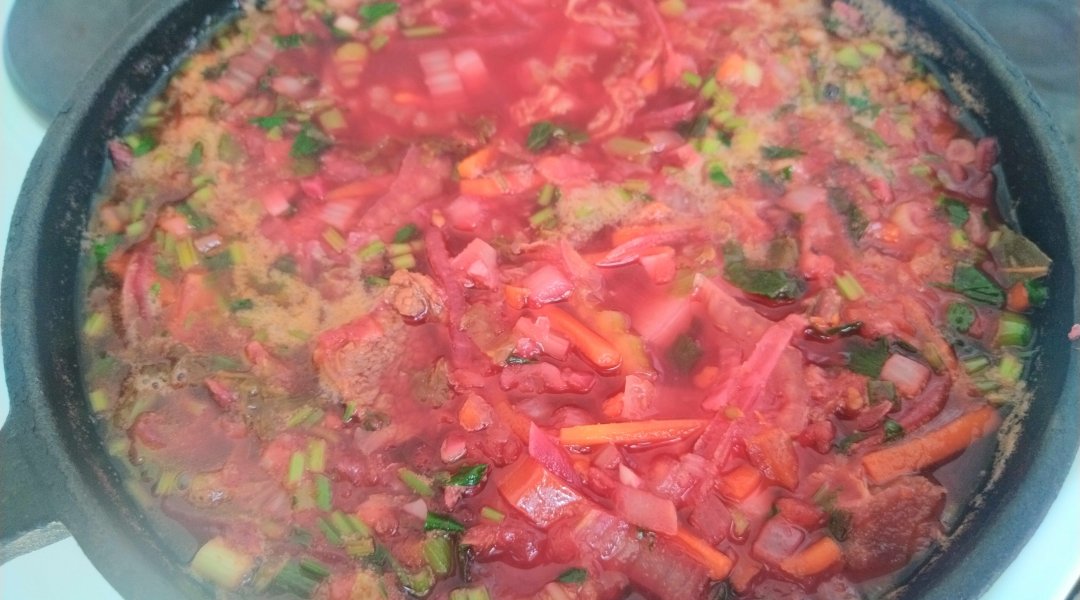 У меня в борще мясо, лук, морковка, свекла, капуста, соленый огурец (выкидыааю после тушения), томатная паста и чеснок