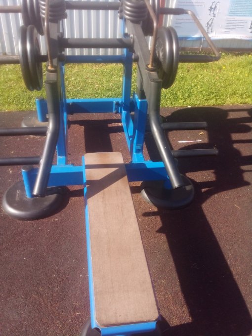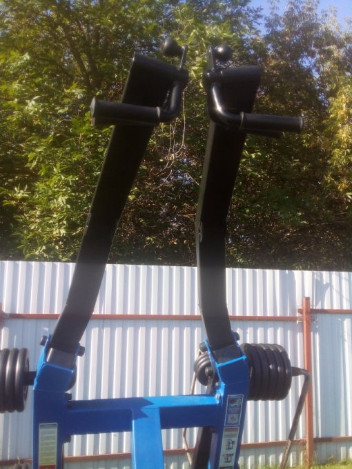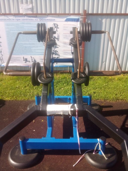 Я использую ее для жима стоя и для тяги в наклоне. Чуть позже буду приседать, пока  приседаю без отягощений, так как 60 кг лишней жировой ткани  - это как встроенная штанга, которая всегда с тобой. Моя оценка 5 из 5.  На фотографии видны следы ленты бумаги скотчем. Написано: "приварить". Не знаю, как можно повредить такой толстый металл. У меня только одна догадка - зимой на стадионе каток, и возможно по тренажеру заехал трактор, которым снег чистят.