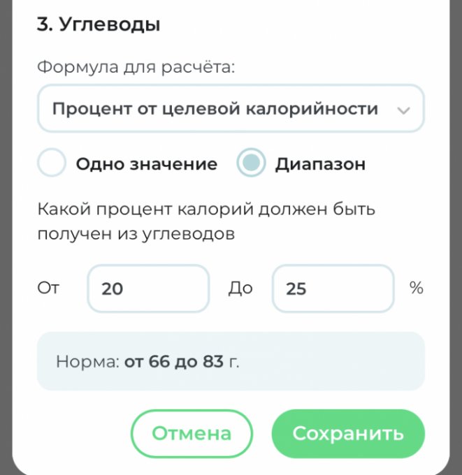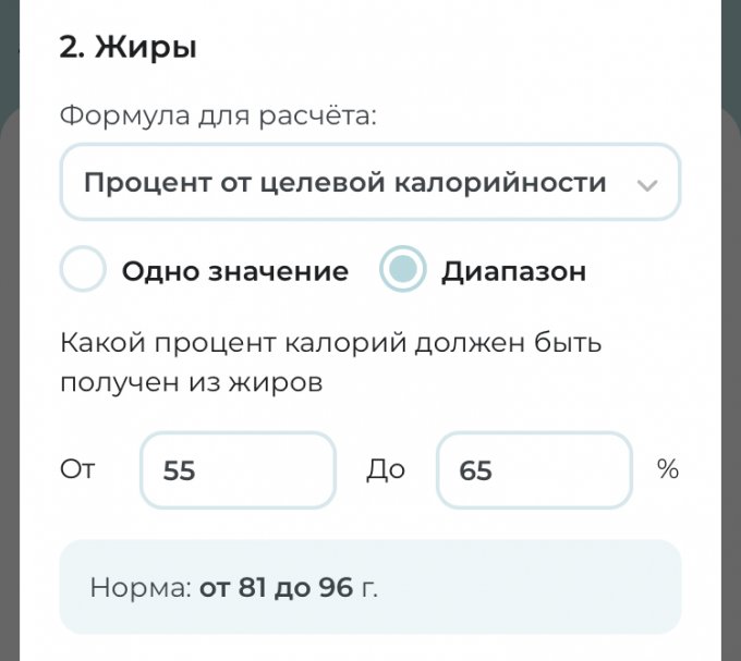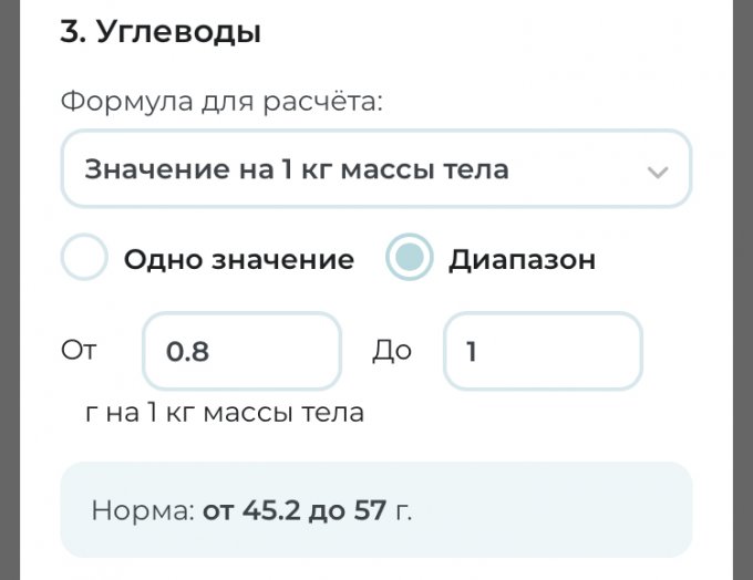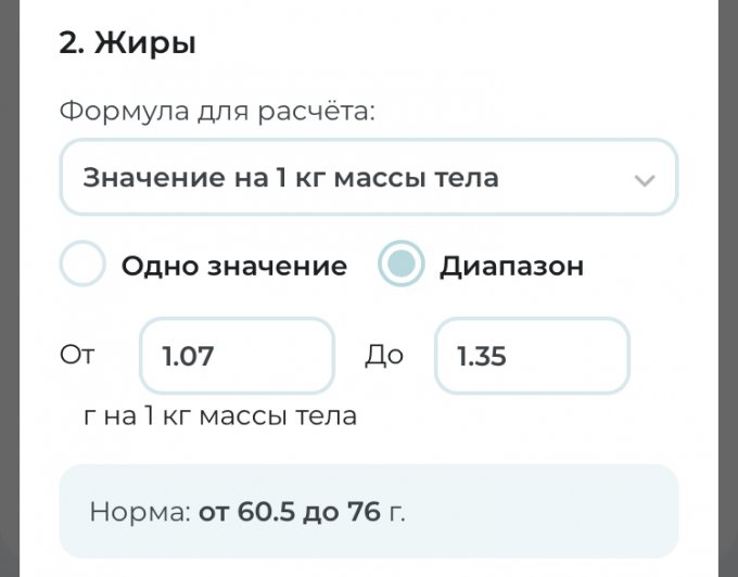 И 70% от общих калорий жиры. Но выставляю тоже на 1 кг веса тела. (От 1,25 до 1,56). Так удобнее мне.