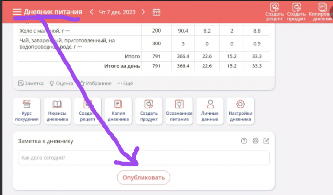 У дневника питания пишете свою заметку и нажимаете опубликовать