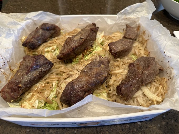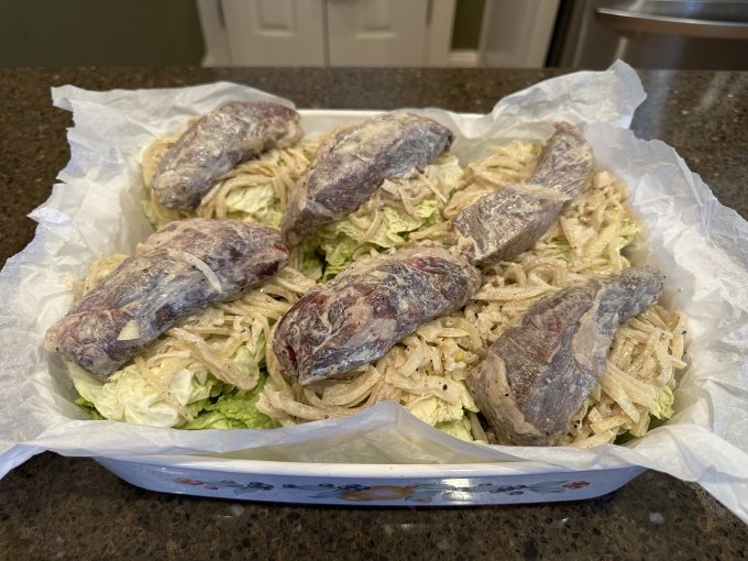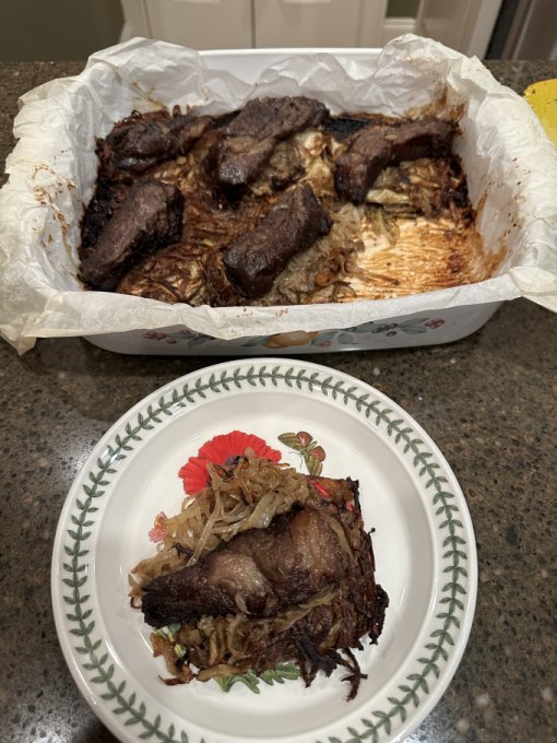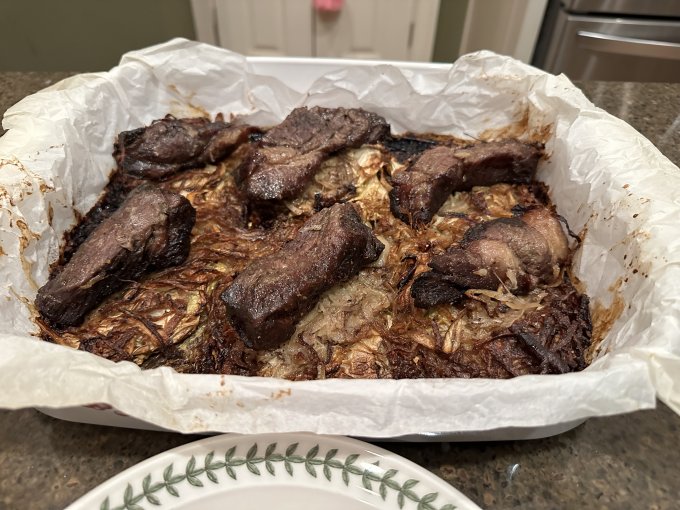 | Говядина, реберный край грудинки (шорт рибс), без костей, только мясо, тушеная |