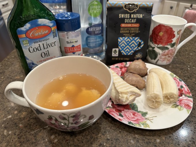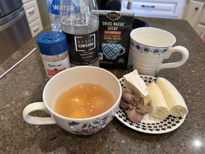 Ланч 🕧 так же как вчера: костный бульон с 3мя желтками, курочкина печень, мягкий сыр бри, кофе с бананом.