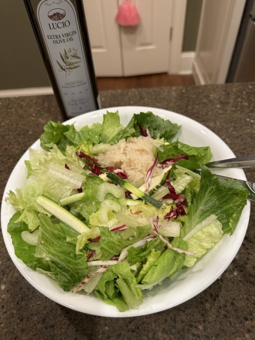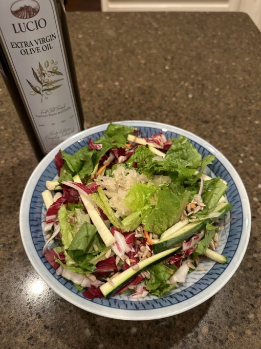 Ужин 🕕 — листовой салат ( латук, сельдерей, цуккини, радикио, квашеная капуста , оливковое масло ), стейк:
