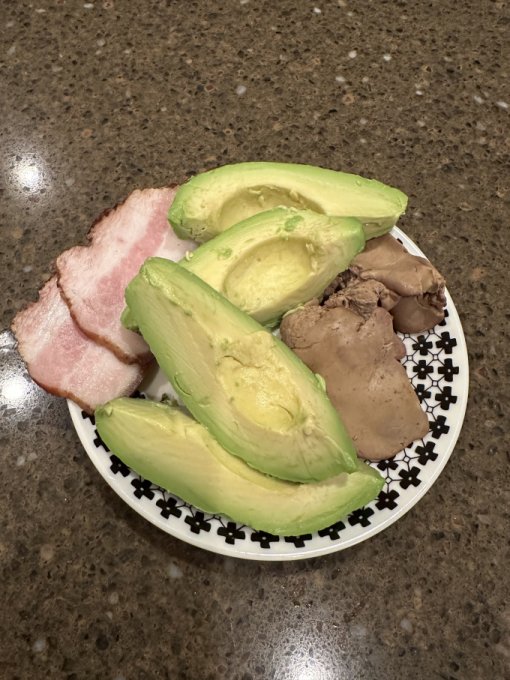 И ещё через 2 часа на ужин авокадо, курочкина печень и копчёное сало.