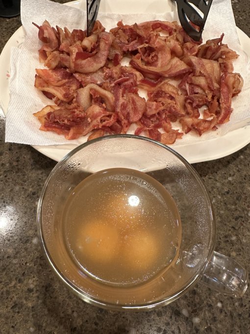 Ланч 🕥 всё как обычно — бульон с желтками, бекон, курочкина печень и кофе с сыром и бананом:
