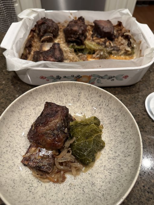 Ужин 🕠 новое блюдо, готовила первый раз и обязательно буду ещё — запечёные маринованные говяжьи рёбра short ribs на подушке из листьев капусты: