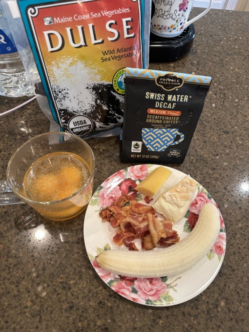 Ланч 🕚 — бульон с желтками и водорослями, бекон, кофе с сыром и бананом: