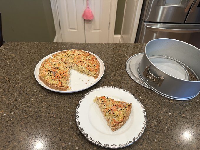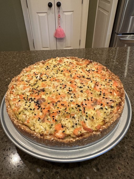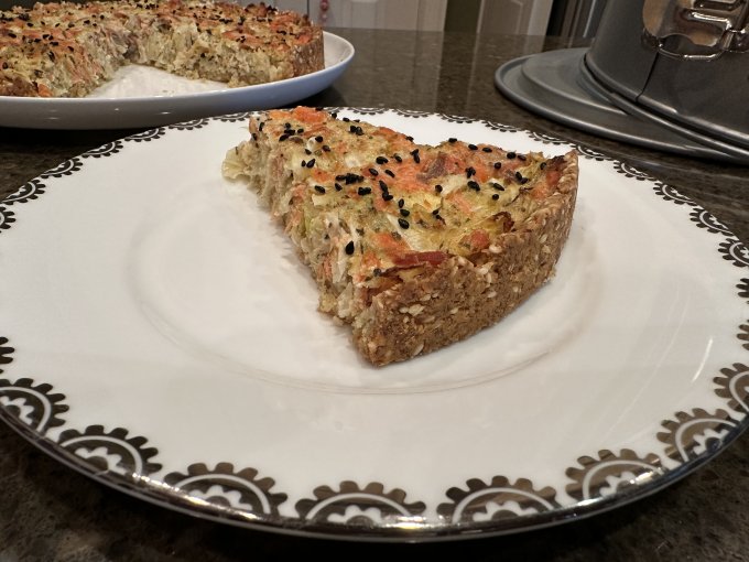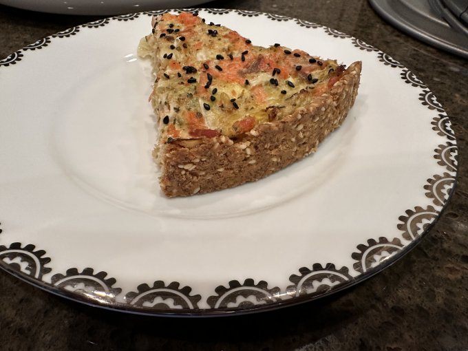 Перекус 🕓 — низкокалорийный пирог ( начинка: рыба + капуста + яйцо + майонез, корж: миндаль + кунжут + псиллиум + яйцо + масло )