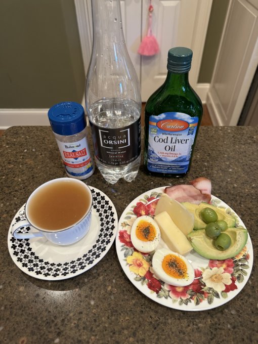 Костный бульон, 1/2 авокадо, 3 оливки castelvetrano, шинка, яйцо,