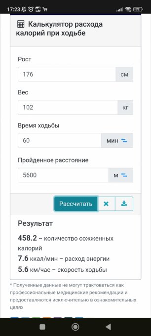 Прошла на дорожке час. Посмотрела сколько по калькулятору расхода