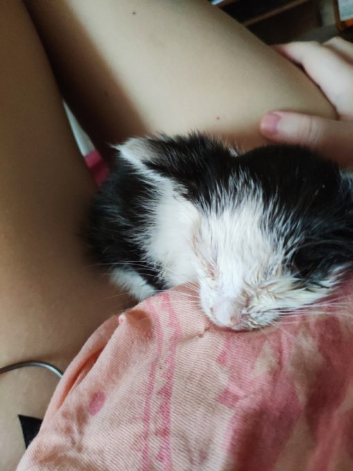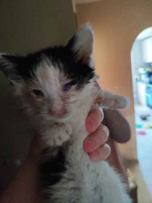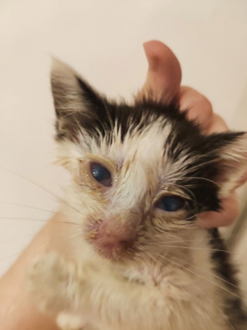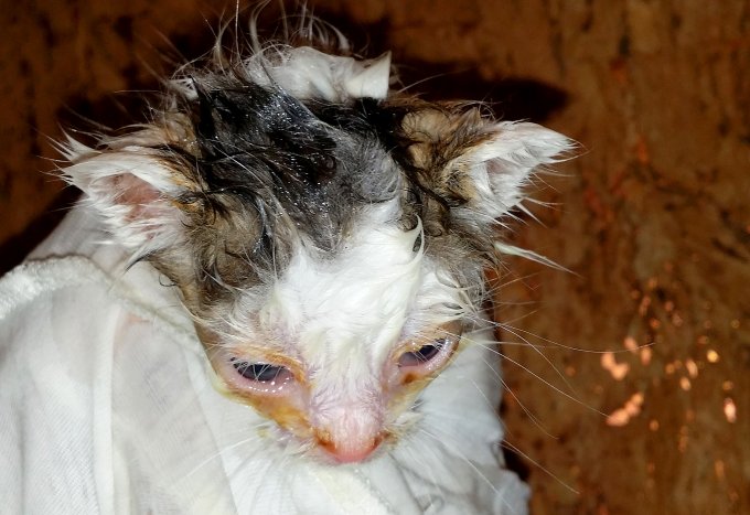 отказалась мать, и этот котенок сидит с залепленными гноем глазами