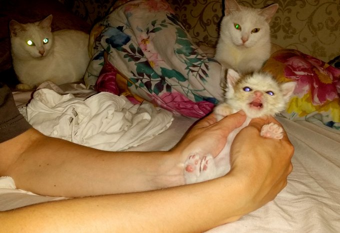 том, что она не сосала бутылку как прежние котята, приходилось