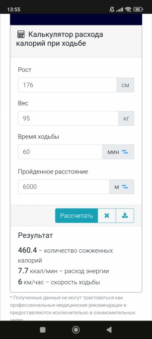 Прошла ещё час на 6км.ч. итого если судить по калькулятору траты
