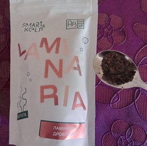 Сегодняшний рацион. Получила сушеную ламинарию, теперь заживем. :) Из рыб и морепродуктов йод в нормальном количестве есть только в минтае и кальмаре, я не настолько их люблю, чтобы есть каждый день. Поэтому буду добавлять ламинарию как источник йода к другим рыбным блюдам. В неполной чайной ложке 1 гр ламинарии, этого достаточно для покрытия суточной потребности в йоде.