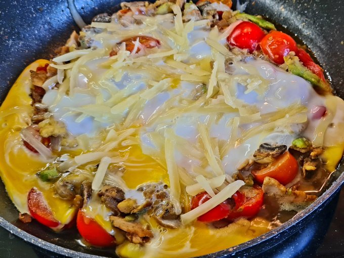 На завтрак намешал себе в яичницу всякого, так что это получилась не яичница с овощами, а, скорее, овощи с жареным яйцом :-)