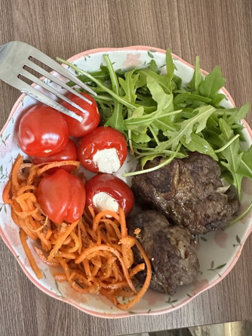 Обед: говядина рубленая , перец чили со слив сыром, морковь по-корейски, руккола, помидорки Чили