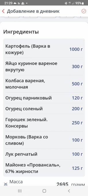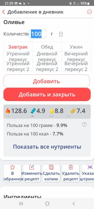 | Итого за день | 2580 | 1844 | 72 | 88 | 184 |