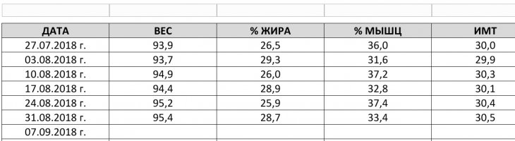 ИМТ 30,0 , % жира - 26,5, % мускулатуры 36,0. Поглядим,