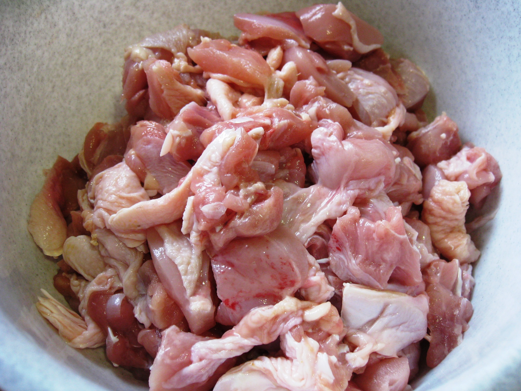 Порезать курицу небольшими кусочками (я брала мясо окорочков без