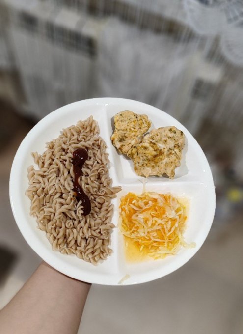 На обед приготовила макароны из полбы и куриные котлеты из филе + маринованные капуста