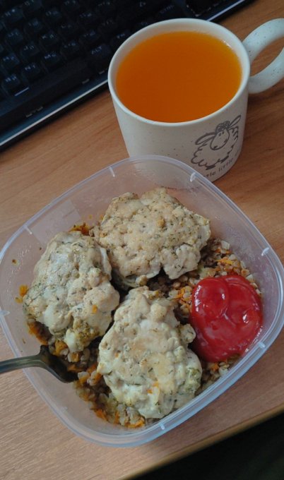 И ещё через два часа я решила, что пора поесть. На обед была гречка с куриными котлетами у меня они элементарные , куриное филе порубила ножом на кубики мелкие, добавила приправу для курицы+ укроп сушёный и чеснок сушёный всё хорошенько перемешала и получилось очень и очень вкусно жарила на нескольких граммах масла