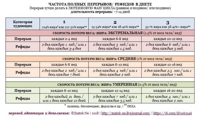 Худеющим категории 3 и соблюдающим большой дефицит, следует увеличивать количество калорий до поддерживающего уровня на 2-3 дня каждые 6 недель диеты.