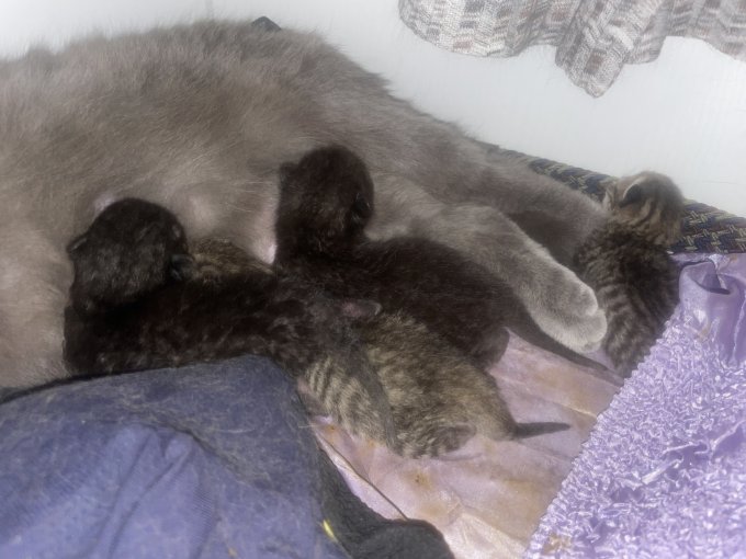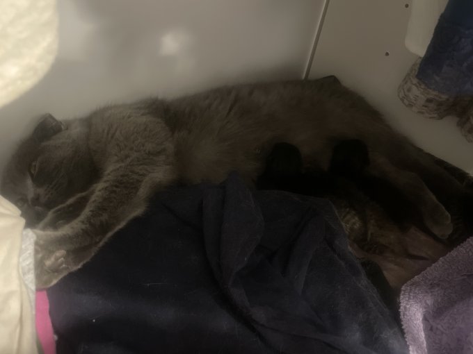 У меня радость, моя сладкая кисуня родила 4х котят (фото приложу), место выбрала такое - мой шкаф, где у меня шмотки сложены, благо ходовые как раз не сложены были, т к жертвую сейчас моим шкафом ради нее, а эти шмотки возможно придется выкинуть, т ч похудеть надо и не переживать, тогда мне один ф эти шмотки уже будут не нужны😂. Такая хорошая мама кисуня моя, все сама и кормит их, и на нас не фыркает, даже глажу ее, пока она котят кормит, но их не трогаю вообще, на всякий😜. Мелкие не прослыли до сих пор, что у нас котята, я молчу, только старшая знает.