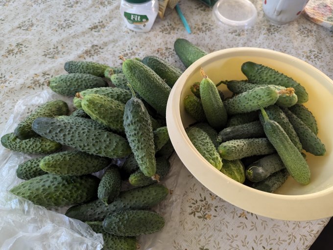 Вот собрала сегодня. У меня посадки огурцов занимают не больше двух квадратных метров. И вот каждый день такое