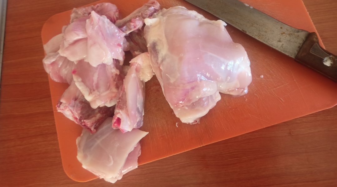 Разморозила бедра, кожу сняла (ваще, убрала всё , что не нравится) нарезала, так как куски для меня большие. С костей не снимала