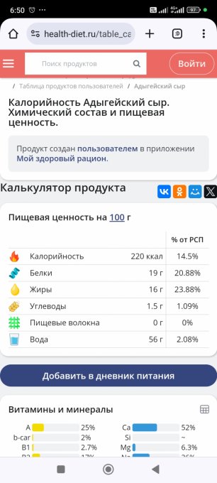 | Кол-во | Калории | Белки | Жиры | Углеводы | |