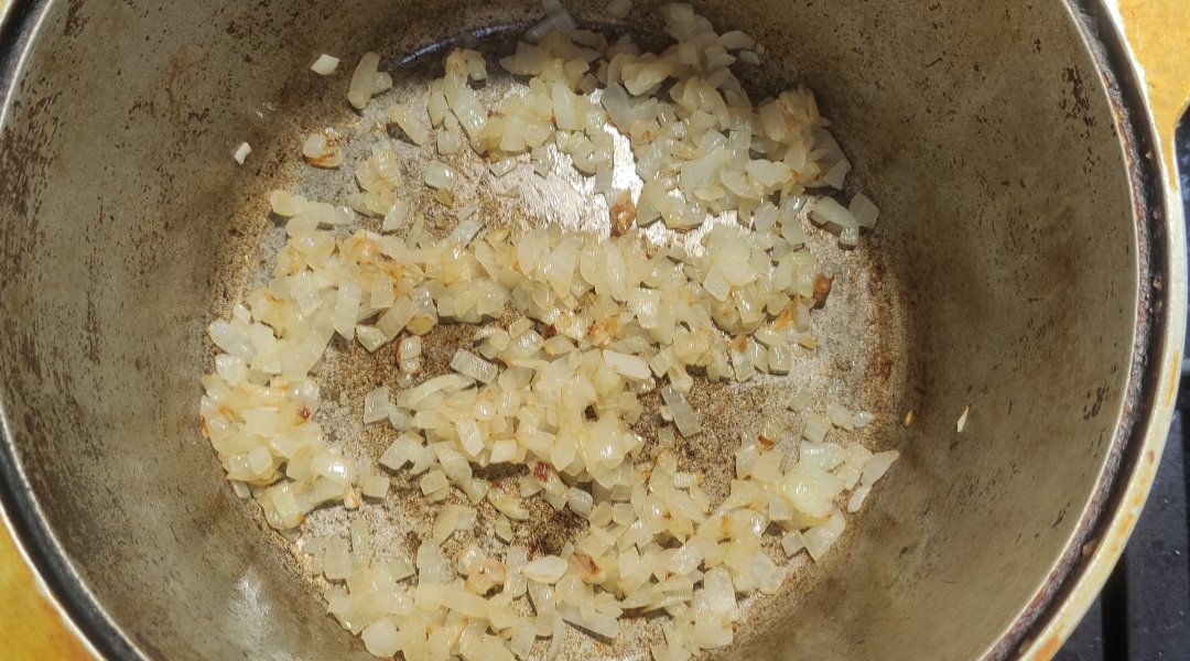В сковороде либо большой кастрюле с толстым дном припекаем лук. Я
