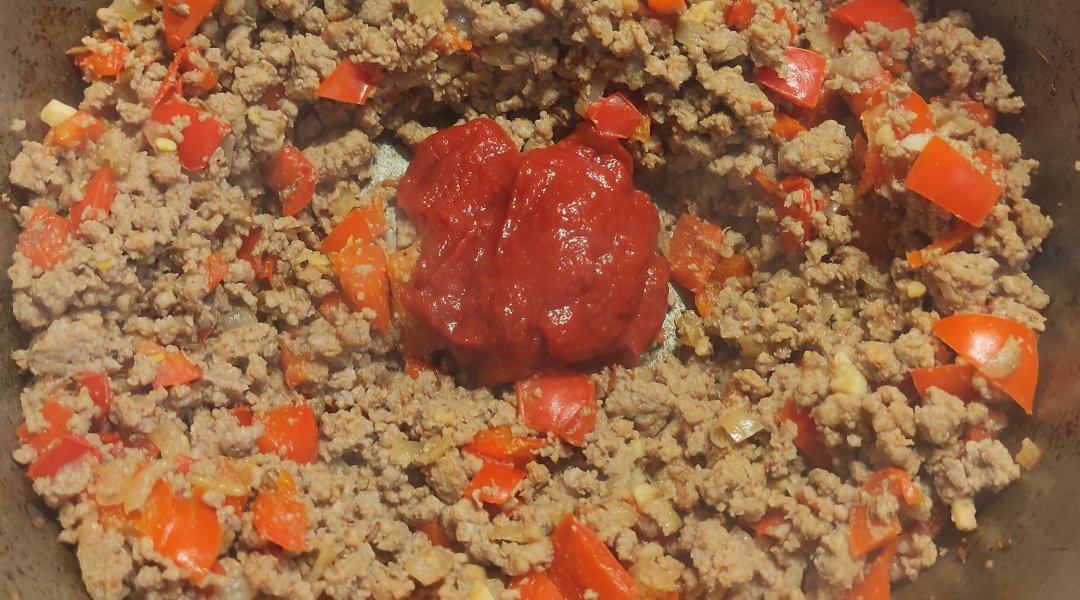 Затем в серединку выкладываем томатную пасту и немного припекаем