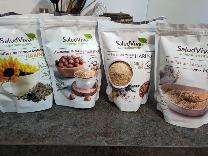 Прикупила онлайн разной орехово/семянной обезжиренной муки, испанской, внезапно. "Обезжиренная" она условно, потому что всё же 20% жира. Но 400 ккал на 100 грамм, а не 600, как в самих семечках/орехах. С большим удивлением обнаружила, что 40 г белка на 100 г. Если делать хлеб (наполовину разбавив водой), то получается почти как кусок мяса по содержанию протеинов. Уже под вечер поняла, как ступила, когда вспомнила, как одержимо ложками ела ореховую пасту, как безумная. Всё-таки семечки подсолнуха надо оставить в рационе как есть, для витамина Е. Да и в семенах льна омега 3 в масле. Да и... Короче, задумалась, какого фига я купила жмых без масла?