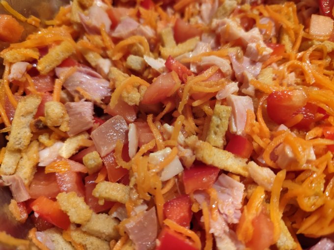Ужин, естественно не ела, но будет салат😋муж вечером говорит, хочу вкусняшку и как назло рядом с нами открыли магазин с русскими товарами, поэтому взяли там сухарей, морковь по-корейски и курицу.