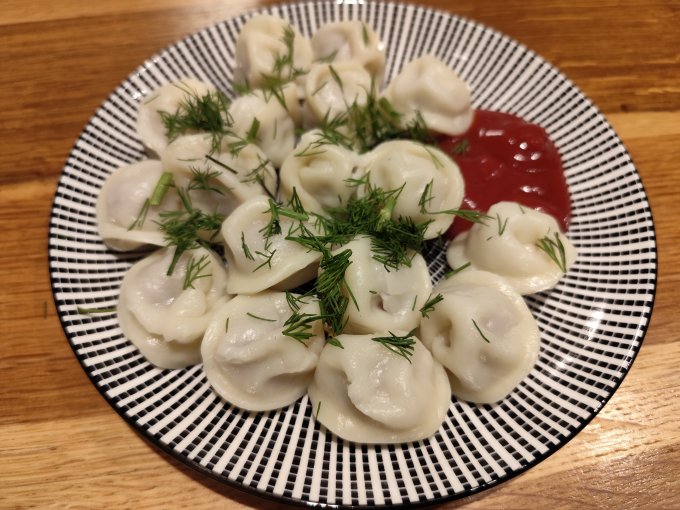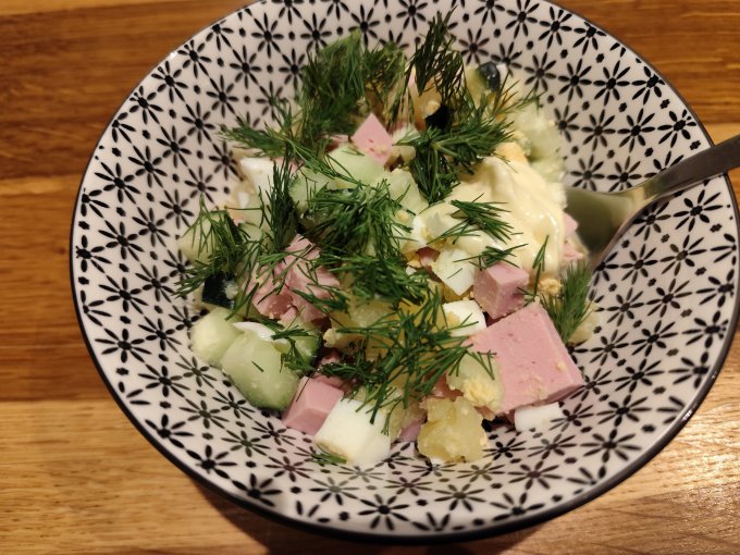 Мой рацион. Сегодня он чисто русский)) Оливье с майонезом и пельмени с кетчупом😋ещё и укроп нашла