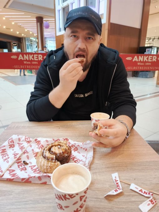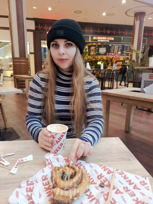 Вчера был классный день провели вместе с женой пили кофе еле вкусную булочку.