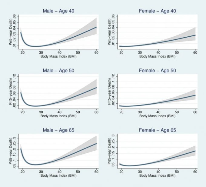 Я так же нашел несколько исследований, где изучались жители некоторых стран с нескольких континентов, в ходе которых получалось, что люди с избыточной массой тела и даже легкой степенью ожирения жили дольше, хотя одновременно и страдали более часто от различных заболеваний, одновременно смертность повышалась у людей с недостаточной массой тела и запущенным ожирением.  Авторы их насколько это возможно пытались убрать некоторые из факторов, которые возможно могли привести к такому смещению, но полностью убрать такую, казалось бы необычную связь небольшого избытка веса и снижения смертости им не удалось.